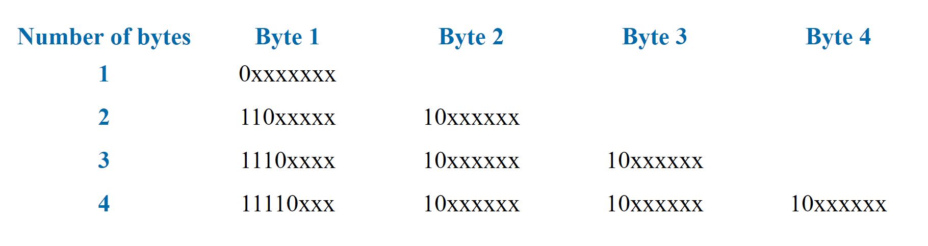The program processing this encoding checks the first bit and estimates the character size in bytes. If an octet begins with 0, the character is represented by 1 byte. 110 - 2 bytes, 1110 - 3 bytes, 11110 - 4 bytes.