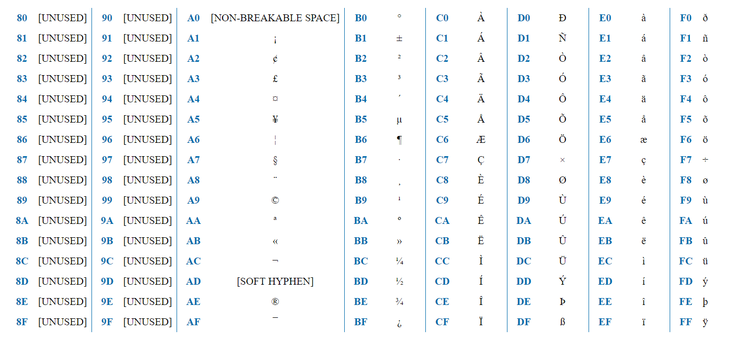 The encoding has 256 characters, thus, can be represented with 1 byte. The first half (128 characters) fully matches ASCII. Hence, if the first bit = 0, it’s a usual ASCII character. If it’s 1 - we recognize a specific ISO-8859-1 character.