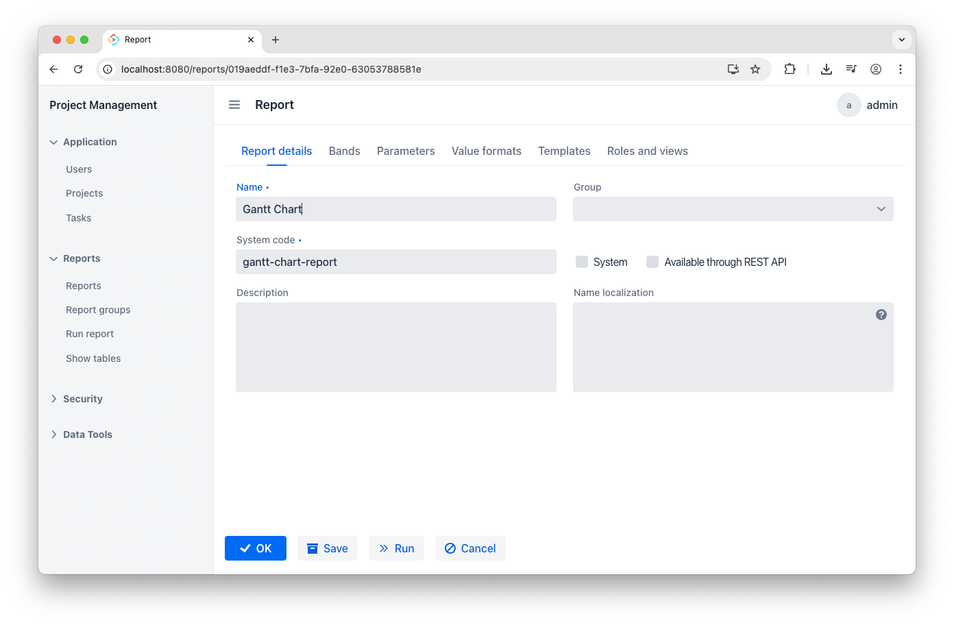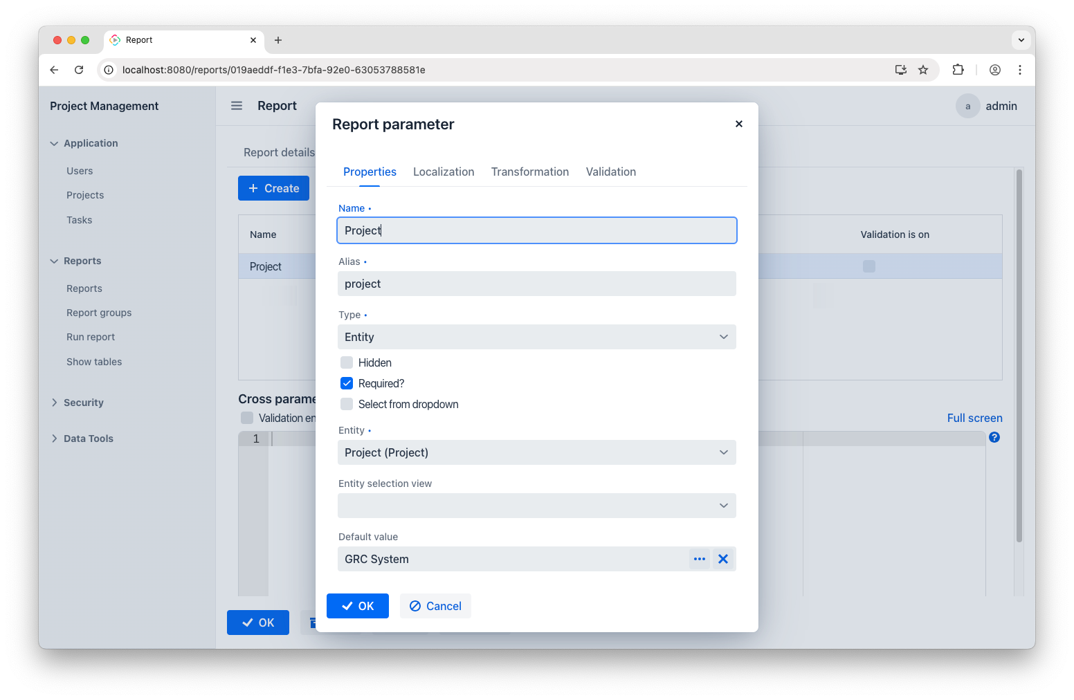 Next, go to the Parameters tab. Our report needs two parameters to function. The first is the Project parameter: