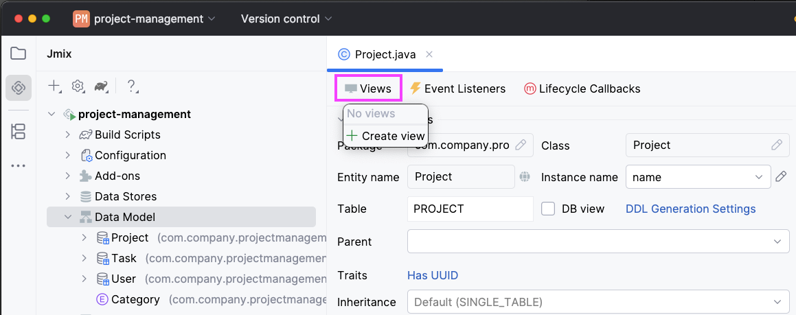 Creating CRUD views is just as simple. Open the Project entity and click Views -> Create view: