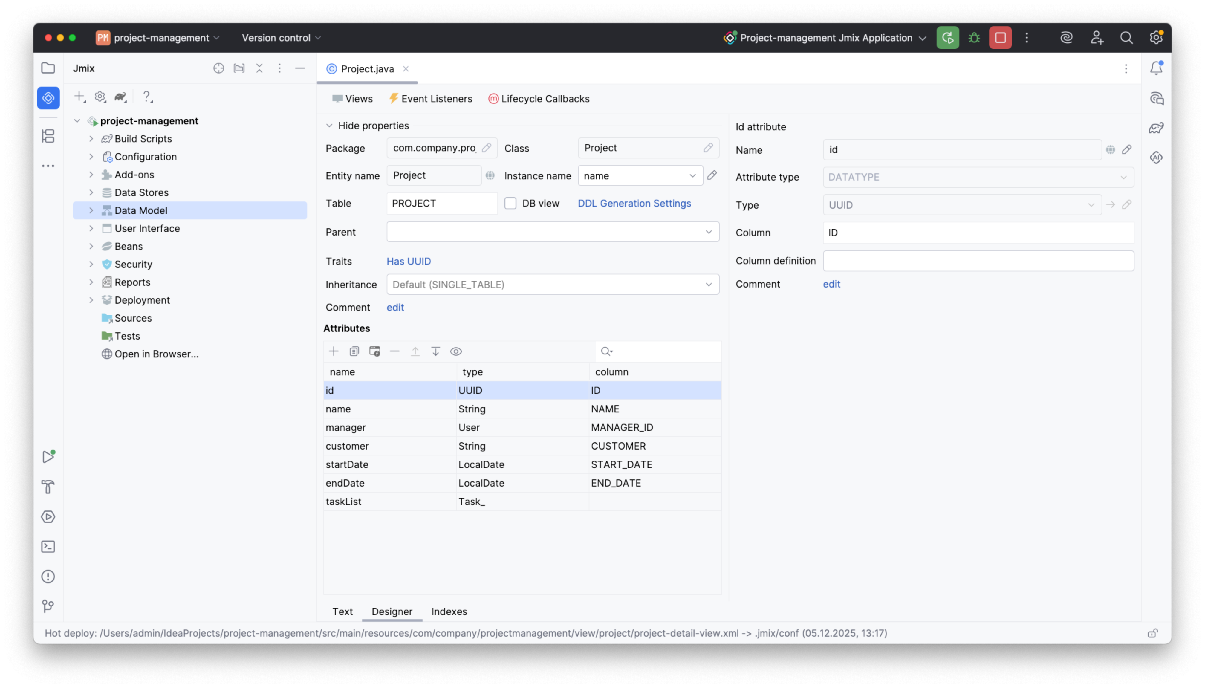 This diagram serves as your blueprint for a project management system. Note that the User entity is present by default, so skip that and just add Project, Task, and the Category enum using the Entity Designer in Jmix Studio. This is what the Project entity will look like: