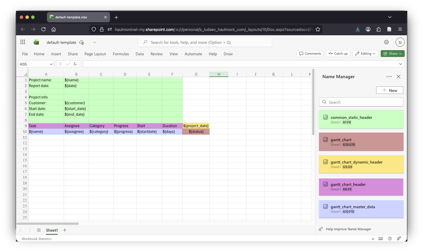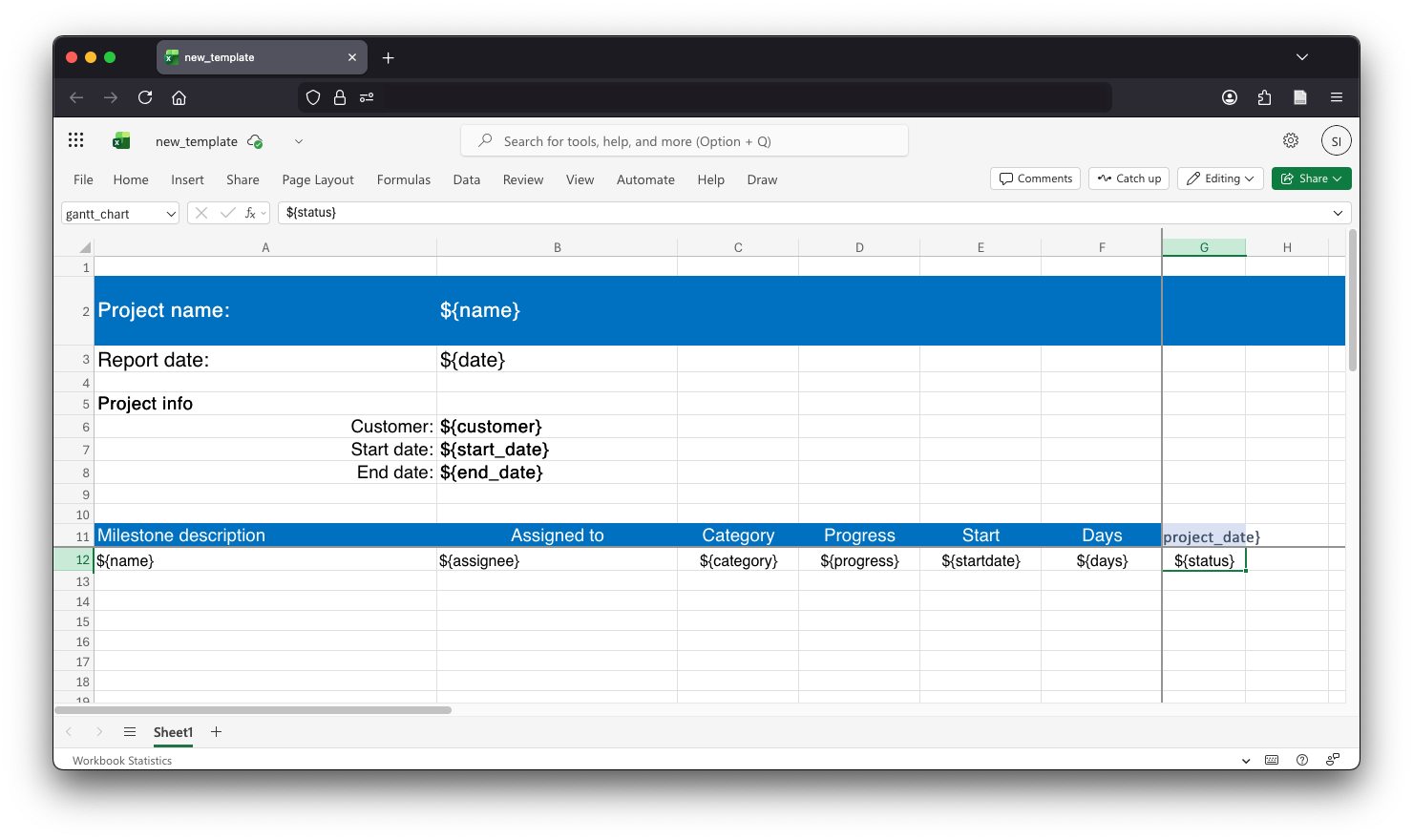 I'm using the web version of Excel, part of Microsoft 365, and here’s what my template looks like:
