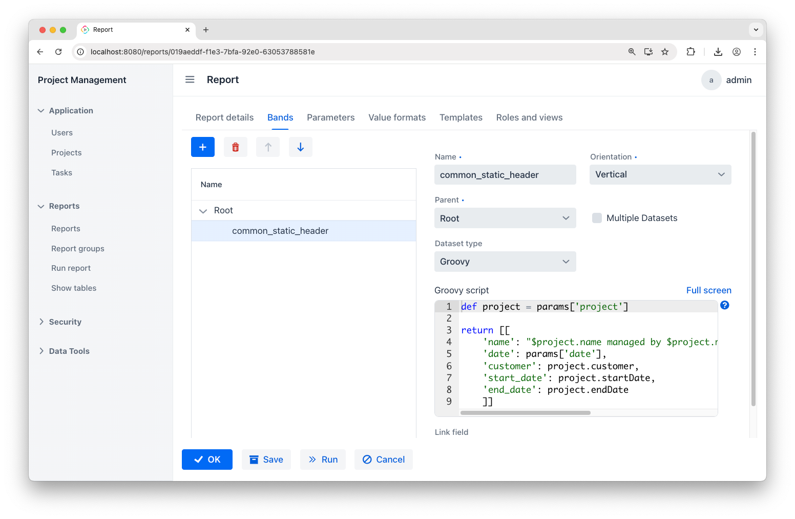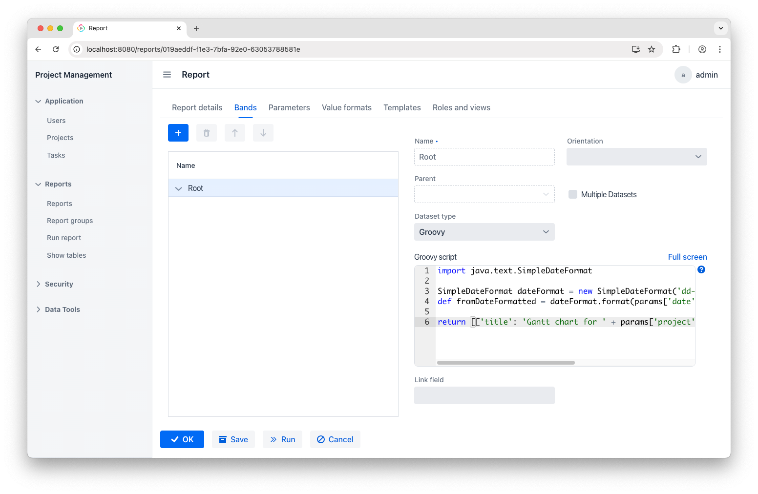 The Root band is predefined. We’ll use it to create a descriptive filename for our report. Select the Root band and add the Groovy script: