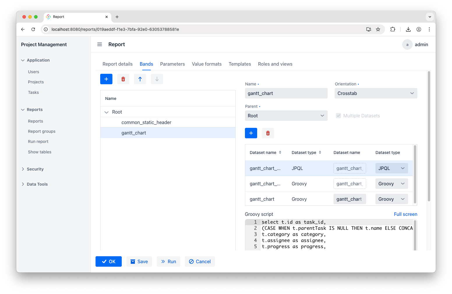 Finally, add the gantt_chart band and set its orientation to Crosstab – it will automatically include three datasets:
