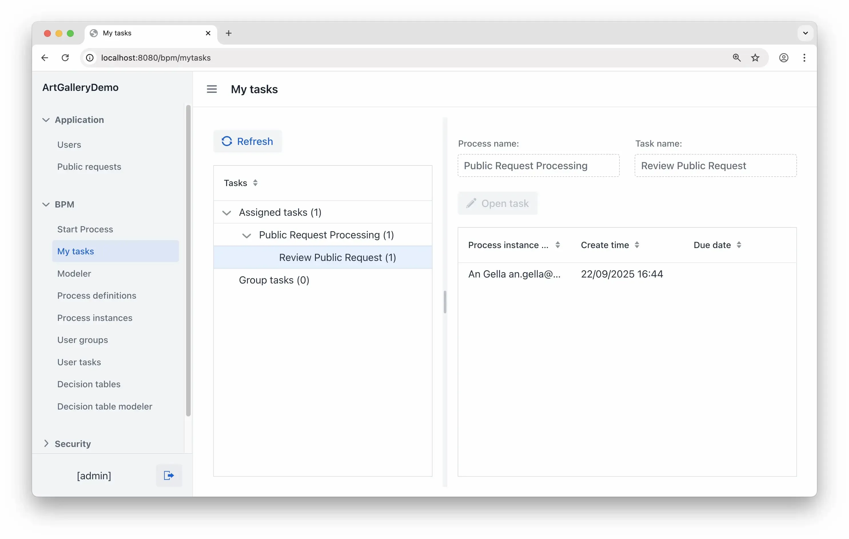 This tutorial explores Jmix BPM capabilities through a practical example: an art gallery website where artists can submit requests to take part in the upcoming event, backed by a collaborative, process-driven application that helps curators review submissions.