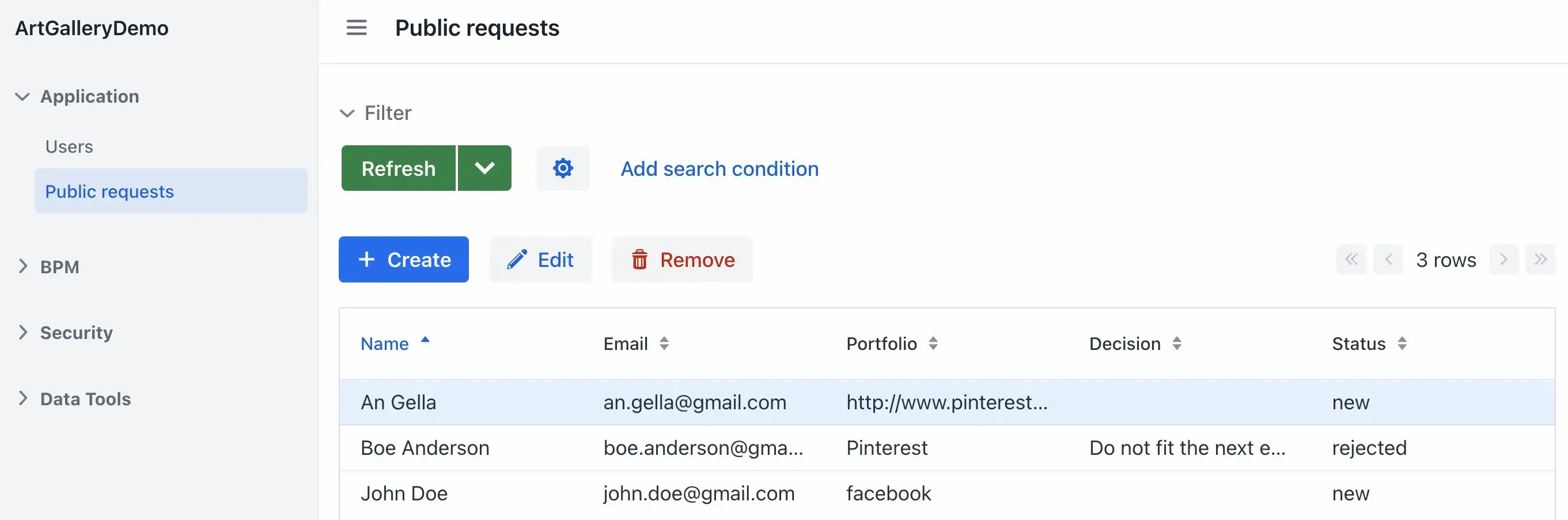 In the Jmix application, go to Public requests and see if An Gella’s request is on the list. This is also to confirm that the data is saved to the database.