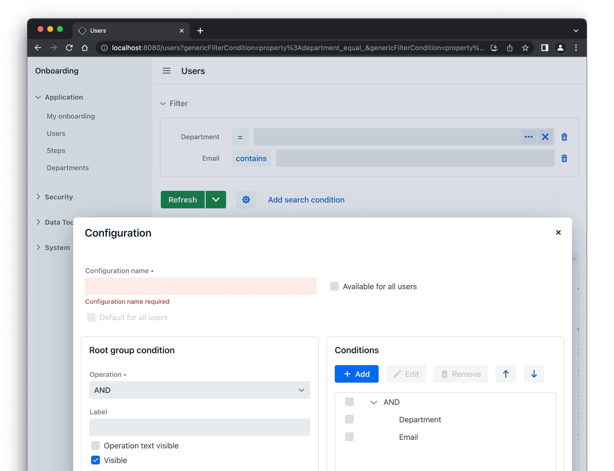 The genericFilter component is now fully-functional and enables you to create configurations and custom conditions both during design time and runtime. The runtime configurations and custom conditions can be managed by end users: