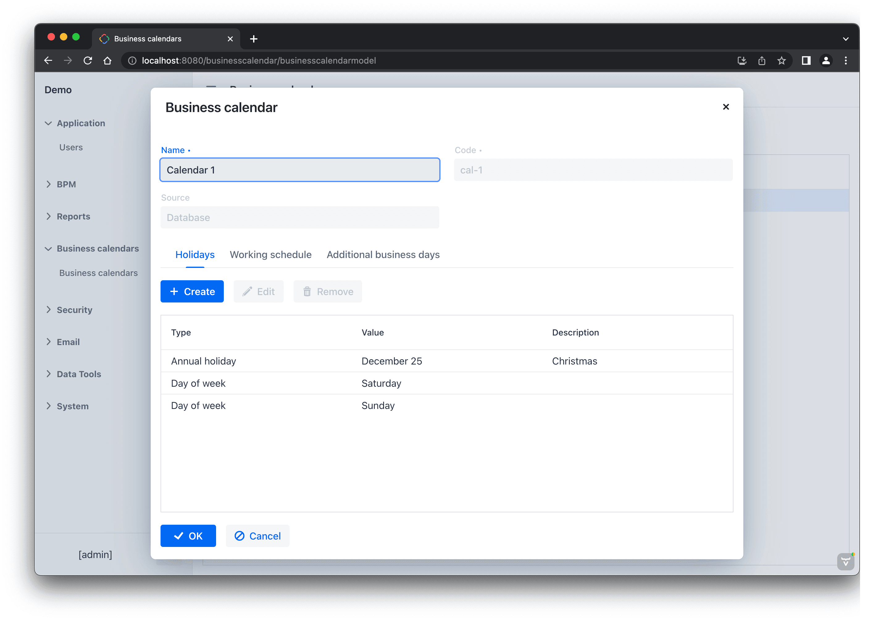 The new UI of the Business Calendars add-on: