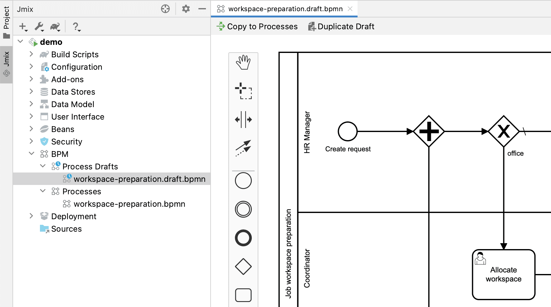 If your project includes the BPM add-on, the Jmix tool window now has the BPM section. The section displays BPMN processes, process drafts and DMN tables: