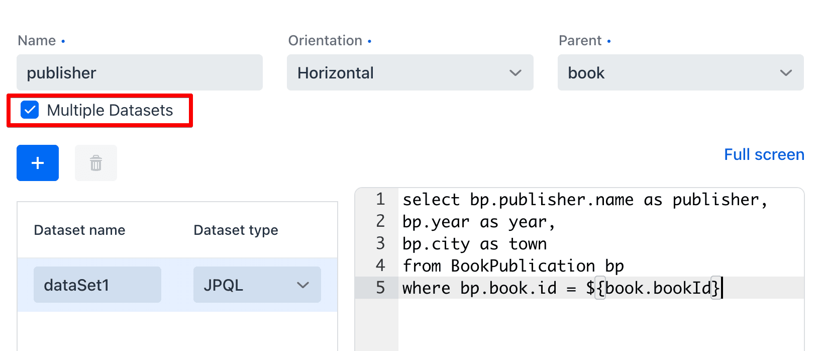 To simplify the UI for most cases, the report designer assumes that a band has a single dataset. But if you select the Multiple Datasets checkbox, the designer will switch to a more complex view: