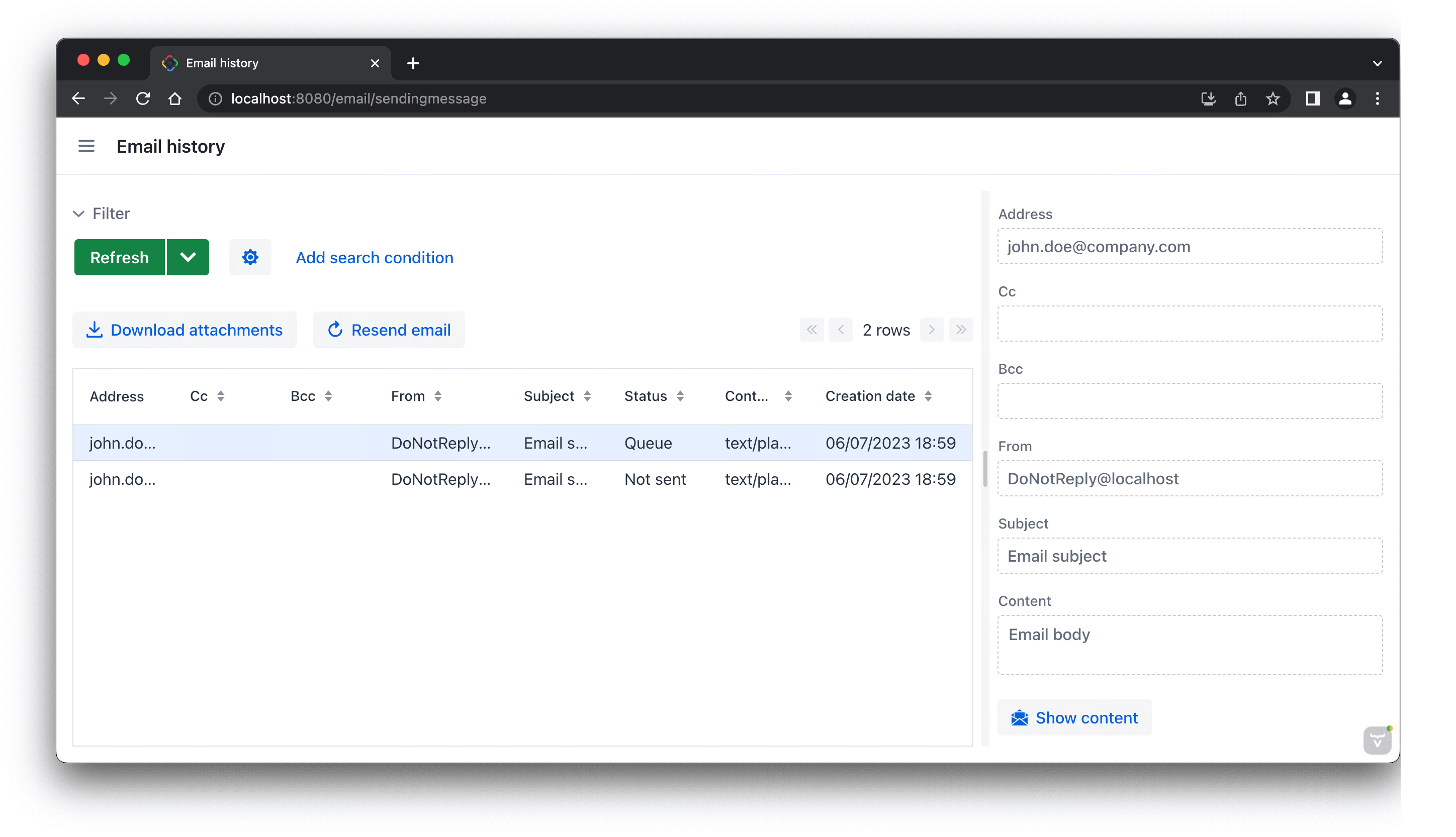 The Email history view: