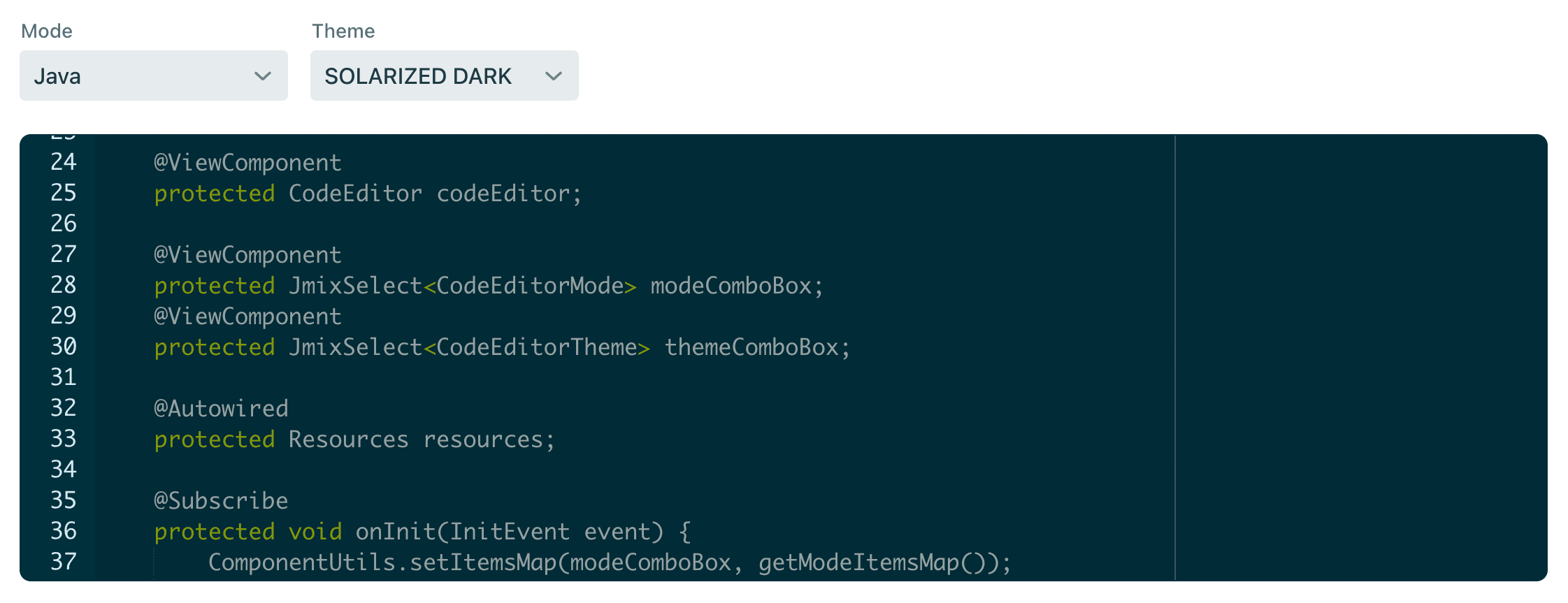 And the same as many other Jmix UI components, it can be easily bound to your data model to edit code stored in an entity attribute.