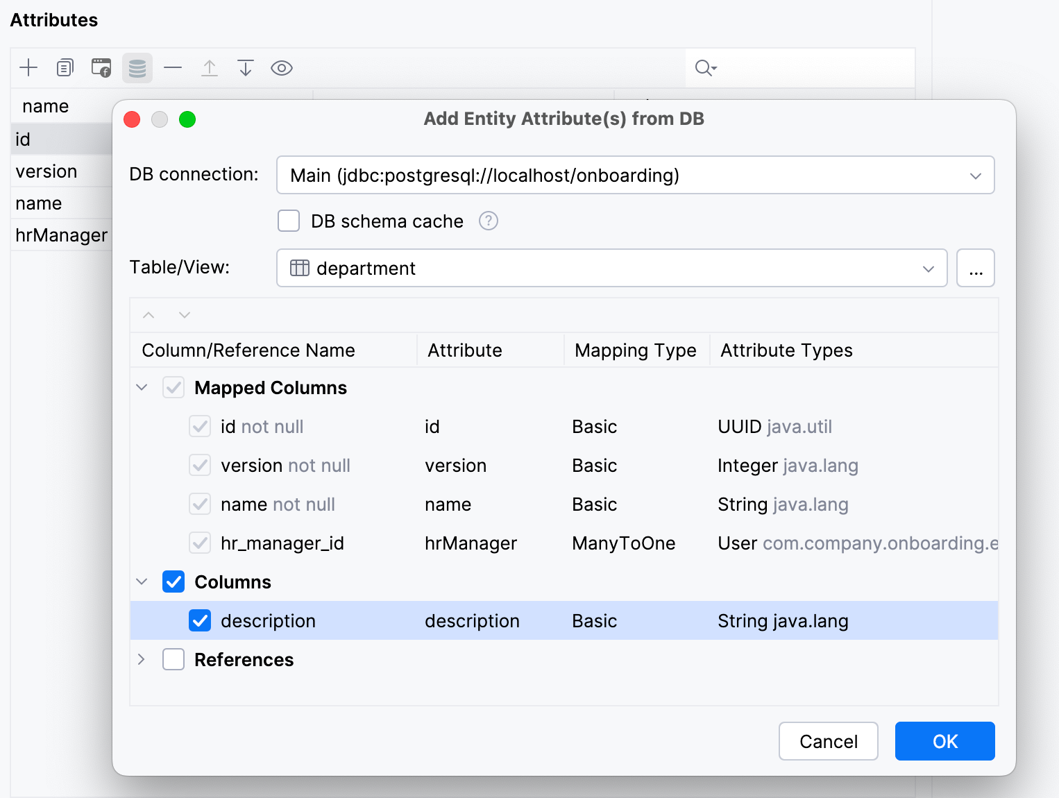 Check out the new "Add attribute from DB" option in the Entity Designer for database-first development. Simply create a column in your database table, then import it directly into your Jmix data model as a mapped attribute. No more manual syncing—Studio takes care of the boring tasks.