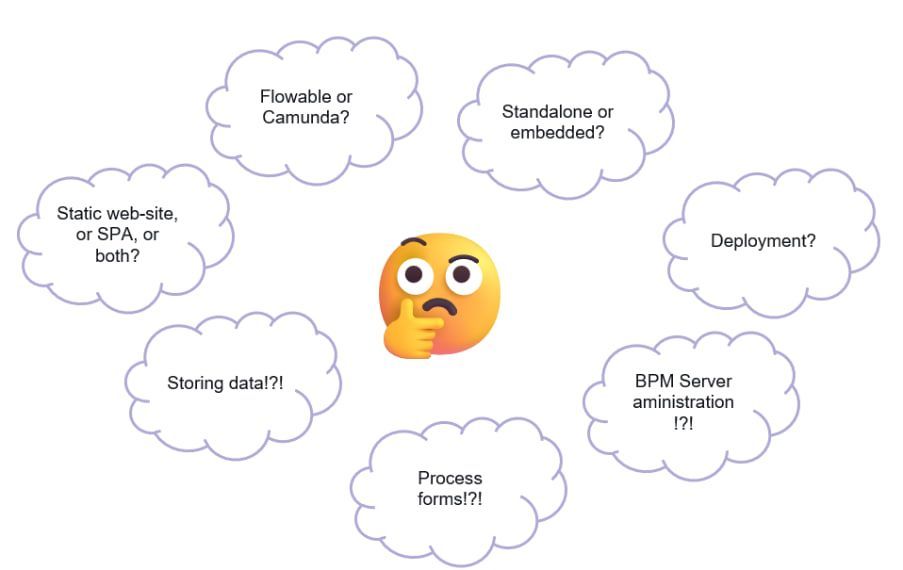 As you start a project, you’ll likely find yourself asking questions and investigating tools. You might consider building a public-facing part using PHP or creating a Single Page Application with React. What about using Next.js for business logic? Which BPM engine would best suit your needs — Flowable or Camunda? Should it be a standalone or embedded solution? How will you manage production deployments effectively? Where should data be stored — on the BPM engine's side or in a separate backend? How to design process forms?