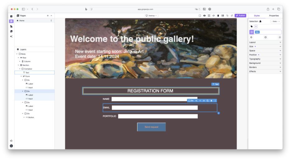 Let’s begin with creating a public-facing part of the service. GrapesJS is a fantastic tool for creating visually appealing layouts without going deep into HTML and CSS.