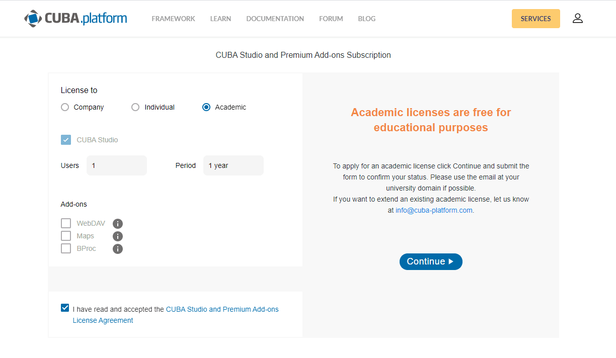 But we all know, the world is desperately short of software developers! So, since the start we offered free CUBA licenses to academic organizations to help them on their mission. For instance, for several years we’ve been providing free academic subscriptions. Not long ago we made the request process even easier. Today it is possible to request an academic subscription both for students and teachers in a few mouse clicks on the CUBA website.
