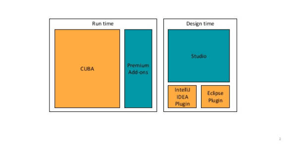 At its highest level, the CUBA-Platform consists of the Design time CUBA Studio which works in concert with either Intellij IDEA IDE or Eclipse IDE. At runtime, it uses a JAVA application server, usually, Apache Tomcat.