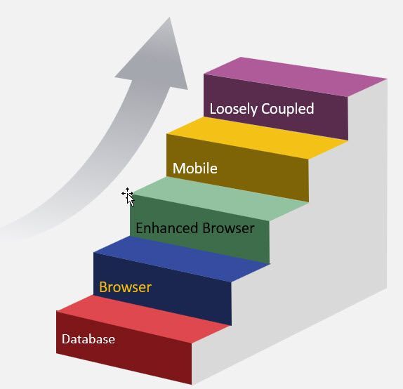 Interfaces that can be loosely coupled with external applications often based in the cloud. The diagram does not show that applications developed today are most often able to be hosted on virtualized servers and/or in containers. The diagram also does not show that applications developed today are developed with newer programming languages and with a number of different database technologies.