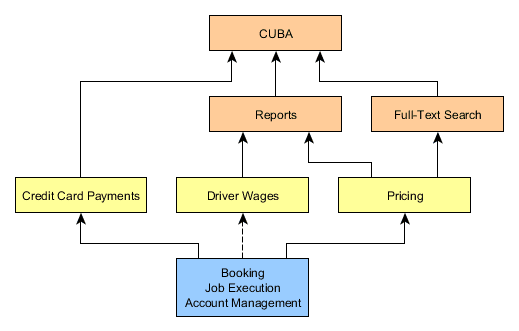 Here CUBA, Reports and Full-Text Search are the components provided by the platform; Credit Card Payments and Pricing are reusable components working in different applications; Driver Wages contains optional functionality delivered only to certain customers. This optional dependency means that you can include app components in an application not only in development but in the deployment stage too.