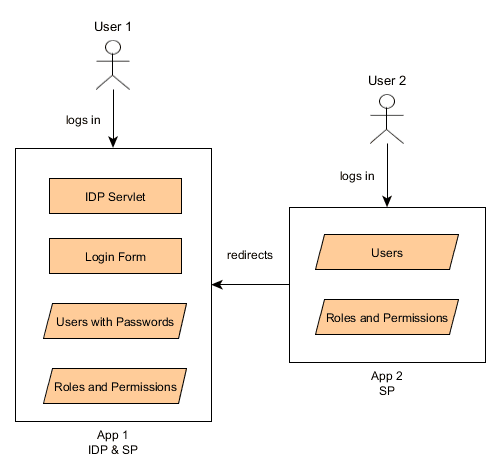The diagram shows an SSO system with two applications. App 1 is simultaneously an Identity Provider and a Service Provider (i.e. just an application providing some functionality). It contains a special login form shown for all users of the SSO system. App 2 is a Service Provider which redirects users to App 1 IDP for login. User passwords are checked only by IDP, but user roles and permissions are completely separate.