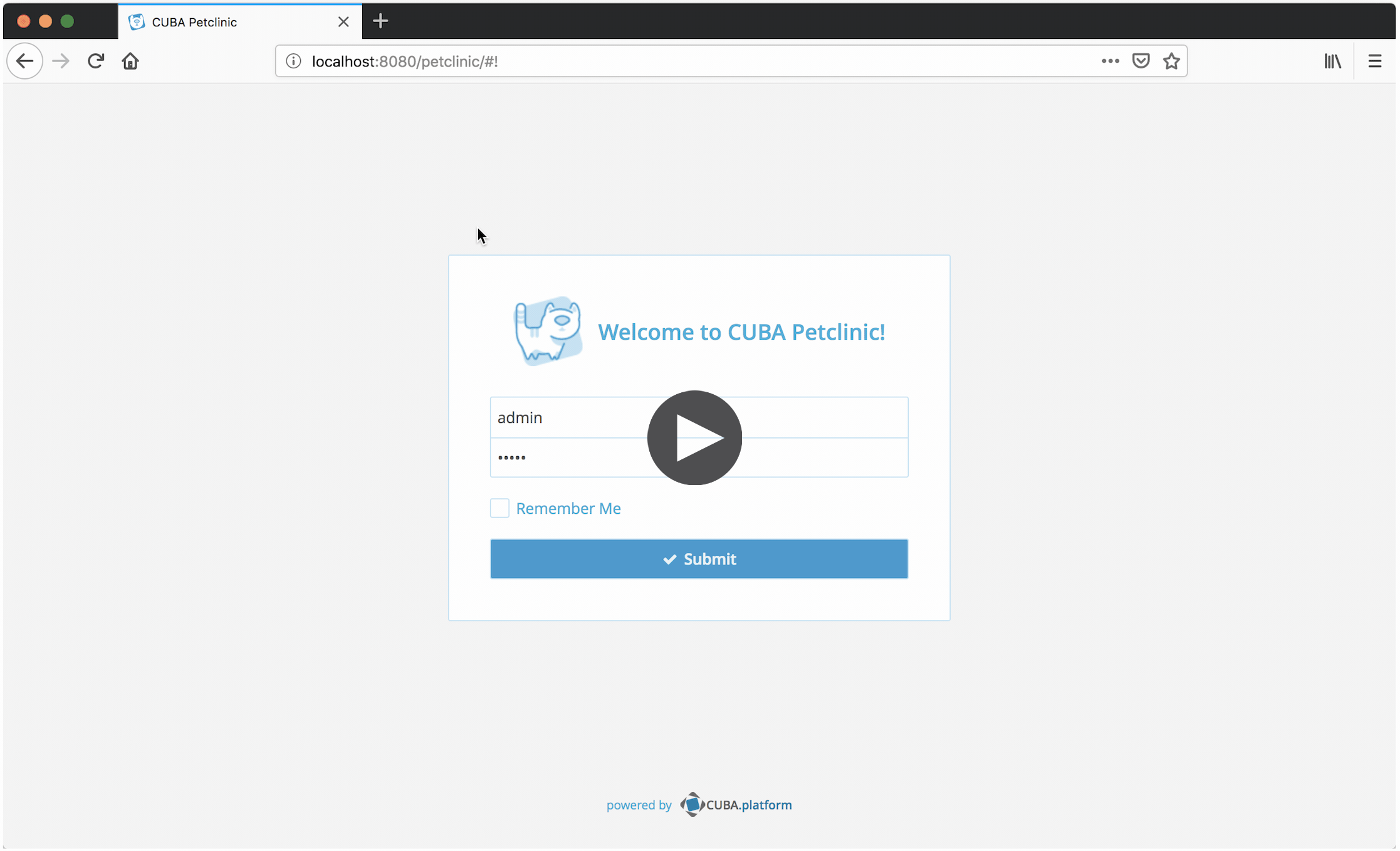 The project that is the basis for this example is CUBA Petclinic. It is based on the commonly known Spring Petclinic. The CUBA Petclinic application deals with the domain of a Pet clinic and the associated business workflows to manage a pet clinic.