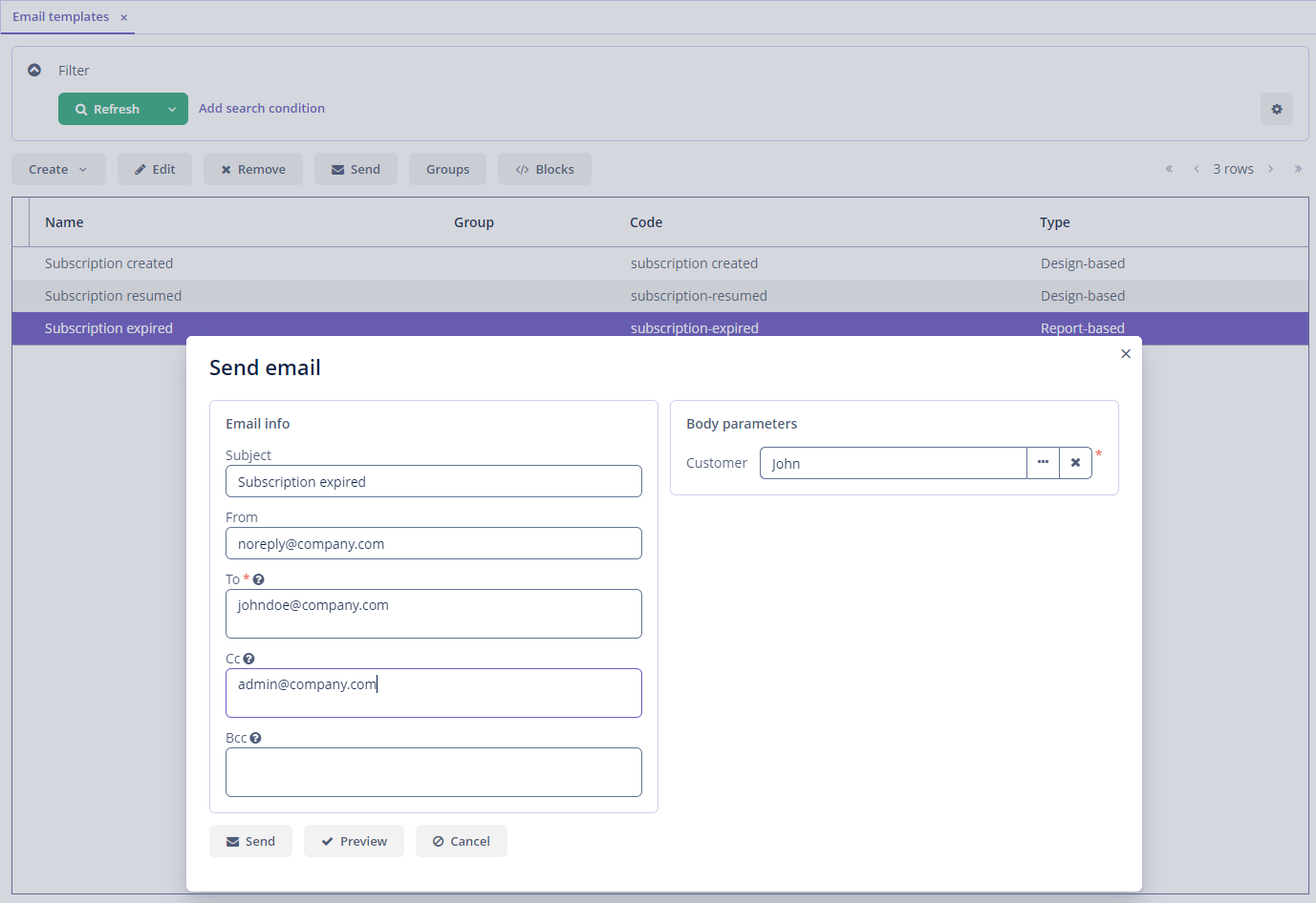 You can send emails created by templates in response to different events of your application. You can preset recipients, configure parameters and upload attachments to be sent with emails.